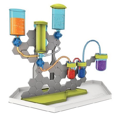 ENDLESS SCIENCE FUN – many experiments can be conducted again and again using common kitchen ingredients. This STEAM kit investigates SCIENCE – CHEMISTRY – Modular Superstructure with Supports – Pneumatic Plunger – Cylinder – 3 Valves – Large Test Tube Holder – Large Test Tube – 2 Elevated Reservoirs – Reservoir Cap – 2 Small Test Tube Caps – 2 Small Test Tubes – 6 Snap Clips – Erlenmeyer Flask – Tall Beaker – 5 Tubes of Science – 5 Tubes of Science – Petri Dish & Lid – Pipette – 10g Calcium Chloride – 59ml Phenol Red Solution – 10g Calcium Hydroxide – 20pH Test Strips – Spill Containment Tray – 32 Page Lab Book.